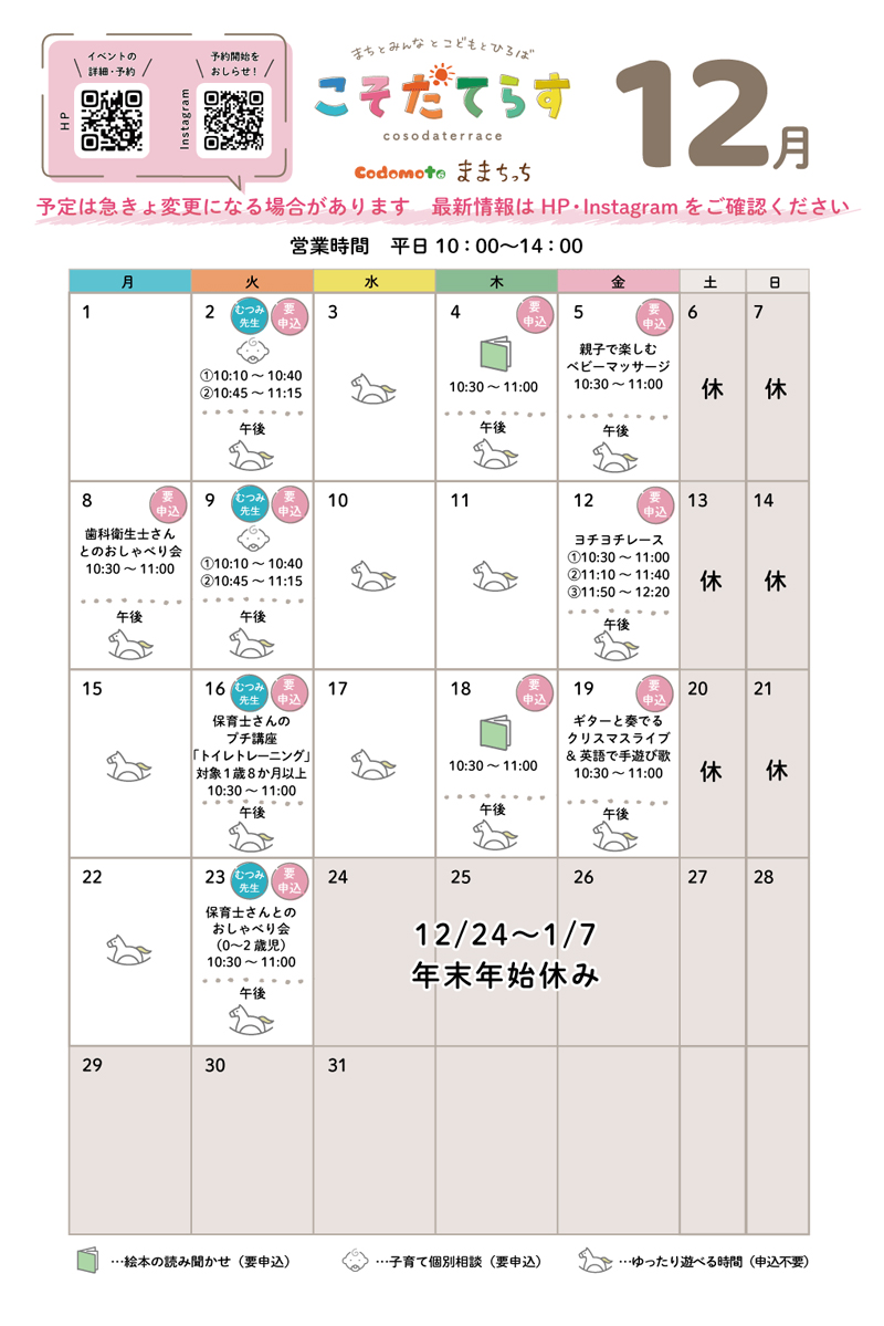 ※こそだてらすの対象年齢は「0歳〜2歳の子どもたちとその保護者」となりますため、対象年齢以外のごきょうだいが休園等でお休みの場合、大変申し訳ございませんが、一緒にご参加いただくことはお控えいただきますようご理解をお願いいたします。