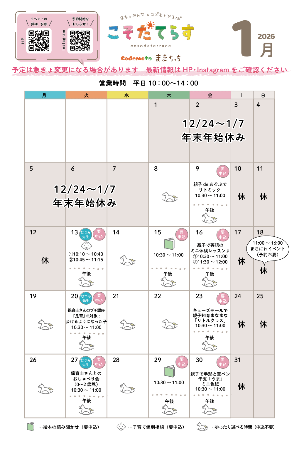 ※こそだてらすの対象年齢は「0歳〜2歳の子どもたちとその保護者」となりますため、対象年齢以外のごきょうだいが休園等でお休みの場合、大変申し訳ございませんが、一緒にご参加いただくことはお控えいただきますようご理解をお願いいたします。