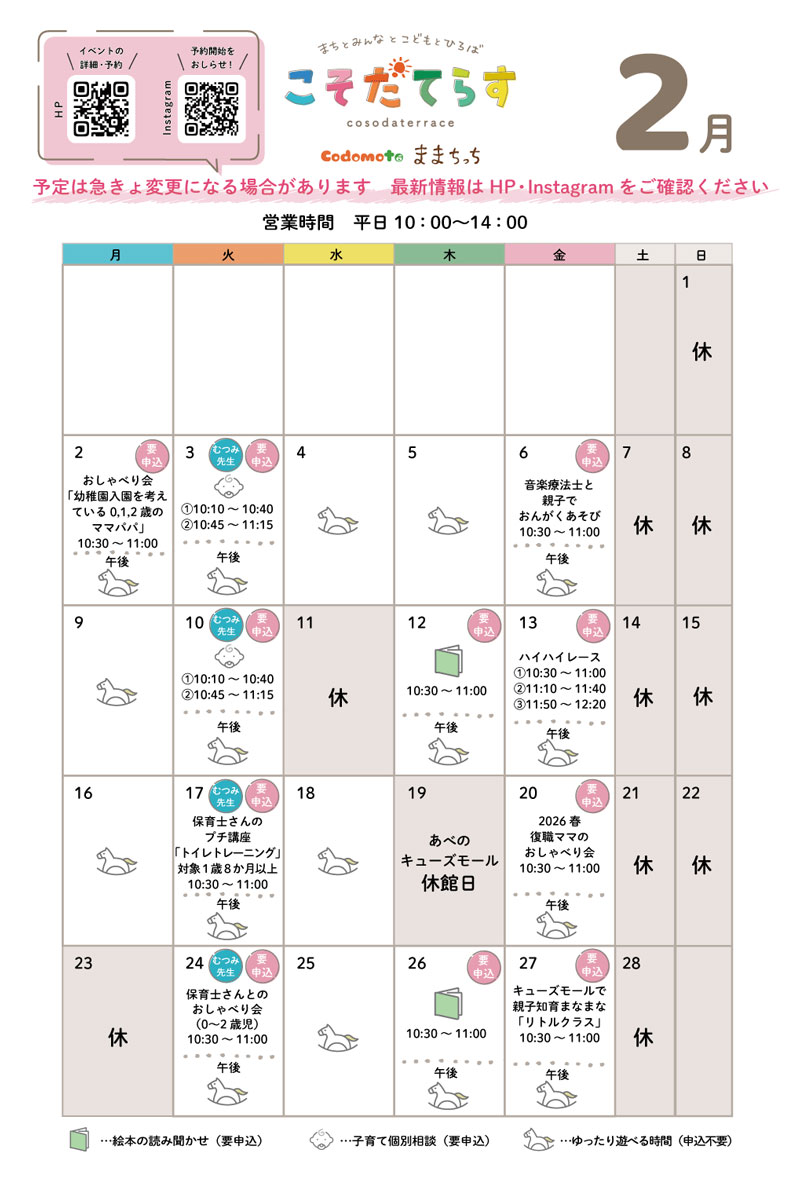 ※こそだてらすの対象年齢は「0歳〜2歳の子どもたちとその保護者」となりますため、対象年齢以外のごきょうだいが休園等でお休みの場合、大変申し訳ございませんが、一緒にご参加いただくことはお控えいただきますようご理解をお願いいたします。