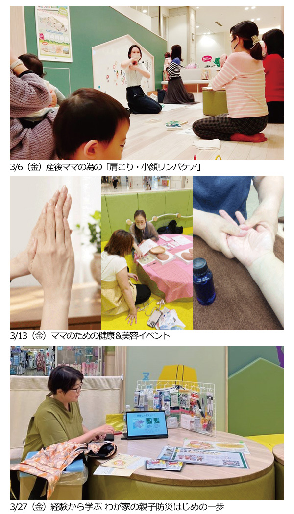 日頃、こどものお世話や家事に追われて自分自身のことはいつも後回し…そんなママたちに向けて、ママ自身の健康&美容などを気にかけてもらうきっかけを作る、“ママのための健康&美容イベント”を開催します。広場内に下記内容の体験コーナーをご用意。この機会にぜひ体験してくださいね♪