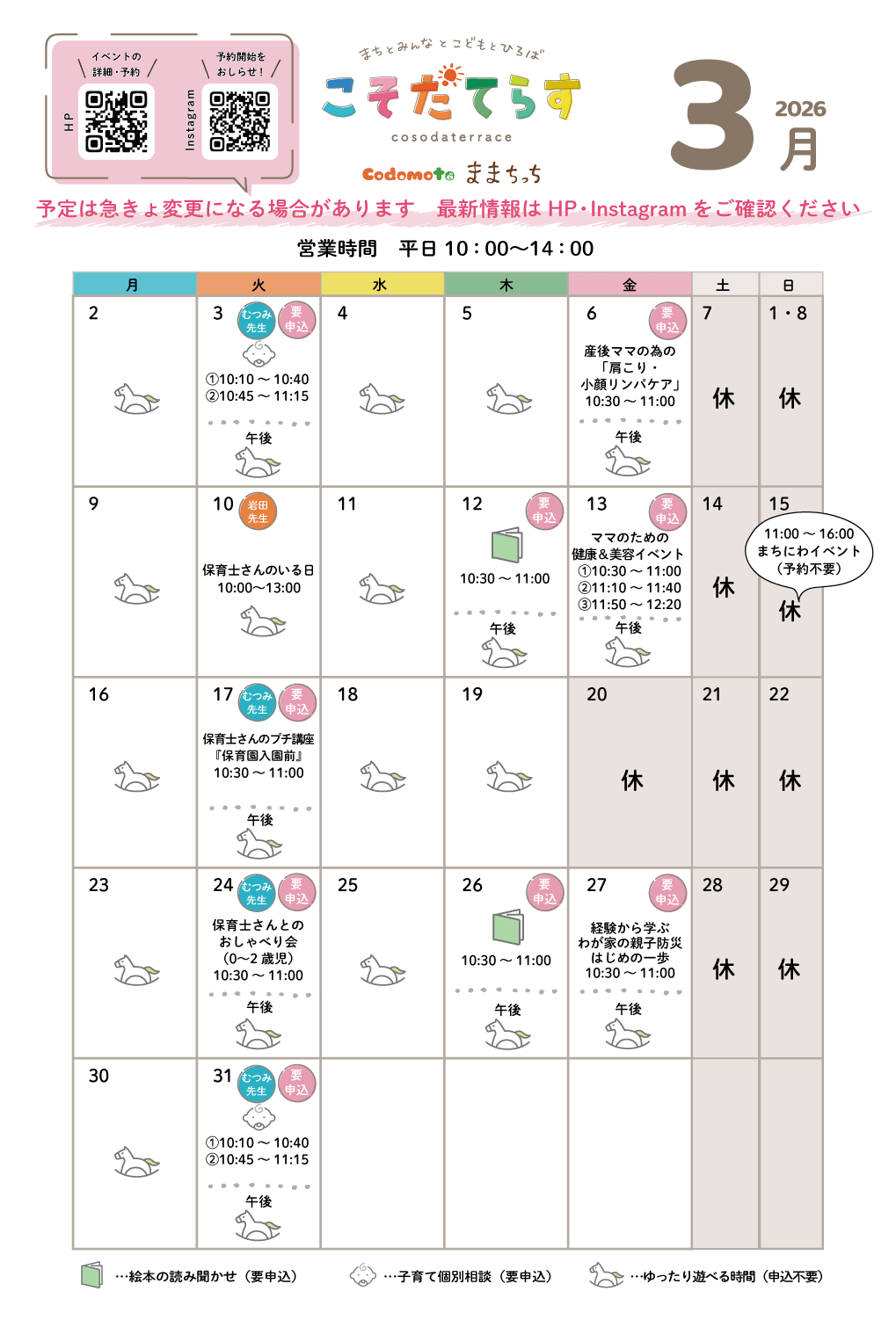 ※こそだてらすの対象年齢は「0歳〜2歳の子どもたちとその保護者」となりますため、対象年齢以外のごきょうだいが休園等でお休みの場合、大変申し訳ございませんが、一緒にご参加いただくことはお控えいただきますようご理解をお願いいたします。