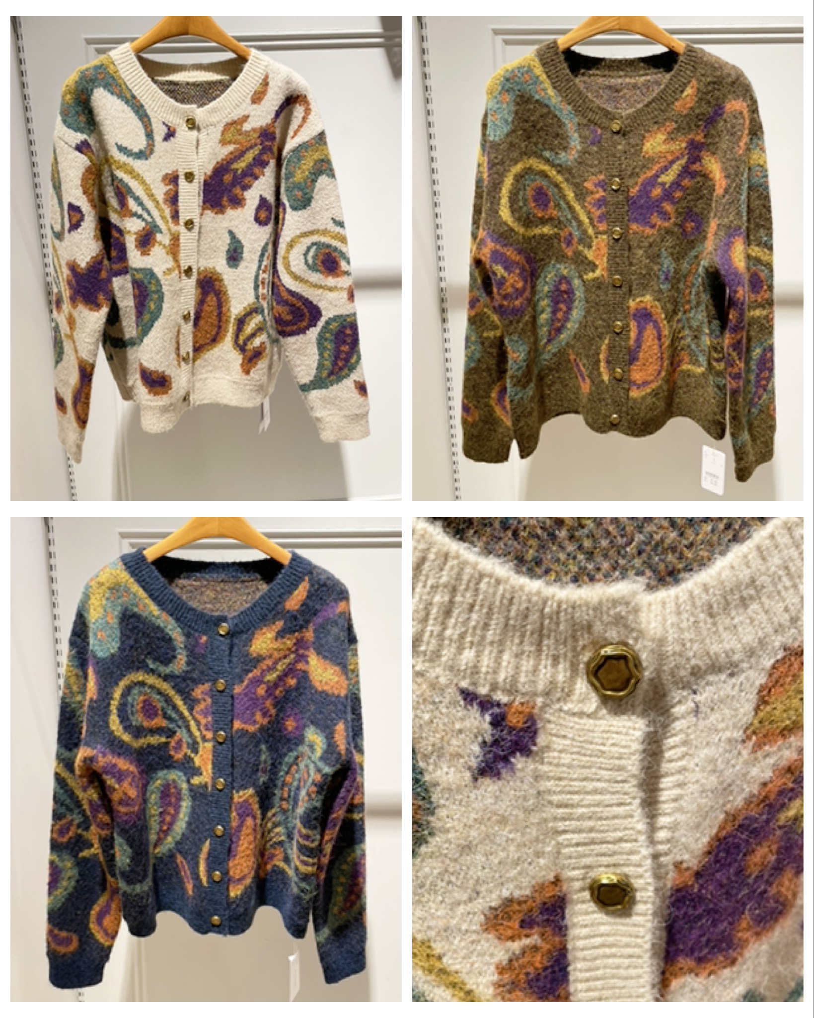 NEW 更新日:2025.10.16 anRipply 06-6646-1201 モヘアタッチペイズリー柄ニットカーディガン クラシカルな雰囲気のゴールドボタンのペーズリー柄ニットカーディガン☆ カラフルなペイズリー柄がオリエンタルな雰囲気を演出してくれます◎ ジャストなサイズ感で使い勝手も抜群、前を閉じてプルオーバー風にも、羽織としても使えてコーディネートの幅が広がります! オンラインストア インスタグラム 関連キーワード #記念日 #プレゼント #新商品 #コーデ #お出かけ X この店舗のショップニュース チェック柄ストレートパンツ LuLuLuniy & anRipply OUTLET SALE☆ リバーシブル起毛ロゴトレーナー フェイクファートートバッグ Instagramフォローキャンペーン開催 スエードポンチジップブルゾン※セットアップ対応 スエードポンチフライトジャケット※セットアップ対応 シャツレイヤードプルオーバー MIXミニループヤーンニットスカート※セットアップ対応 MIXミニループヤーンニットベスト※セットアップ対応