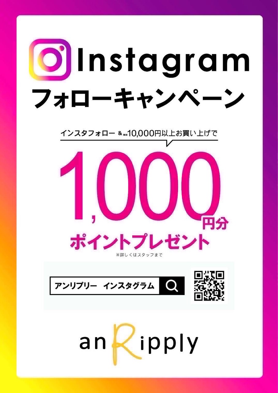 NEW 更新日:2025.10.17 anRipply 06-6646-1201 Instagramフォローキャンペーン開催 ✨Instagramフォローキャンペーン開催✨ 10/16(木)〜11/3(月祝) インスタフォロー➕10,000円(税別)以上お買い上げで自店メンバーズカード1,000ポイントプレゼント‼️???? 是非この機会にお越し下さいませ???? スタッフ一同お待ちしております???? オンラインストア インスタグラム 関連キーワード #記念日 #プレゼント #新商品 #コーデ #お出かけ X この店舗のショップニュース チェック柄ストレートパンツ LuLuLuniy & anRipply OUTLET SALE☆ リバーシブル起毛ロゴトレーナー フェイクファートートバッグ モヘアタッチペイズリー柄ニットカーディガン スエードポンチジップブルゾン※セットアップ対応 スエードポンチフライトジャケット※セットアップ対応 シャツレイヤードプルオーバー MIXミニループヤーンニットスカート※セットアップ対応 MIXミニループヤーンニットベスト※セットアップ対応