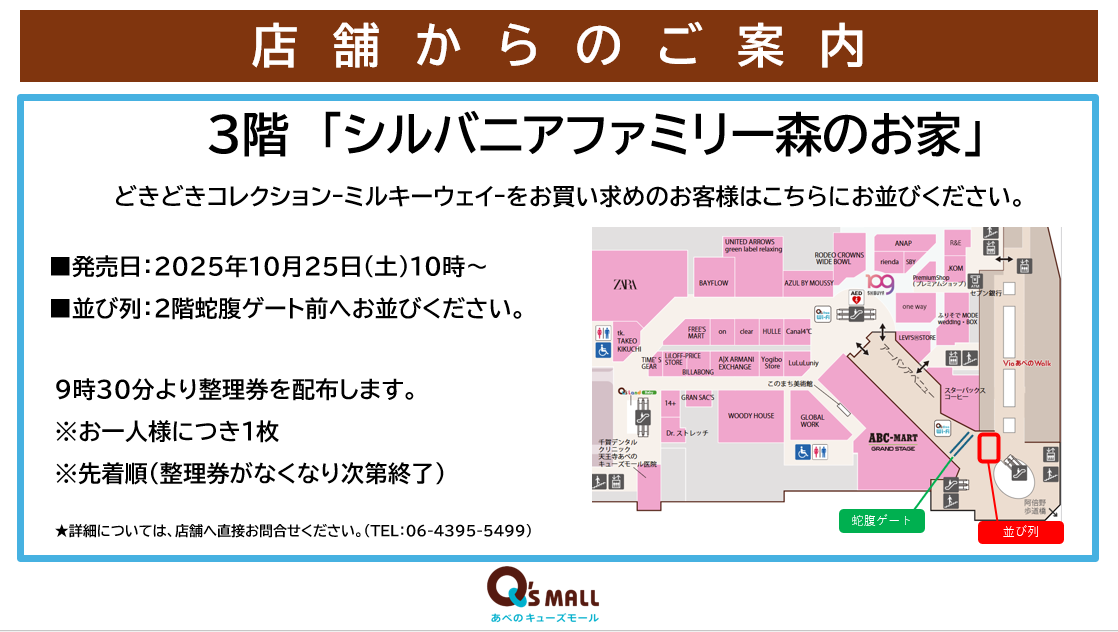 9:30から2階蛇腹ゲート前にお並びいただいたお客様に整理券を配布いたします。
