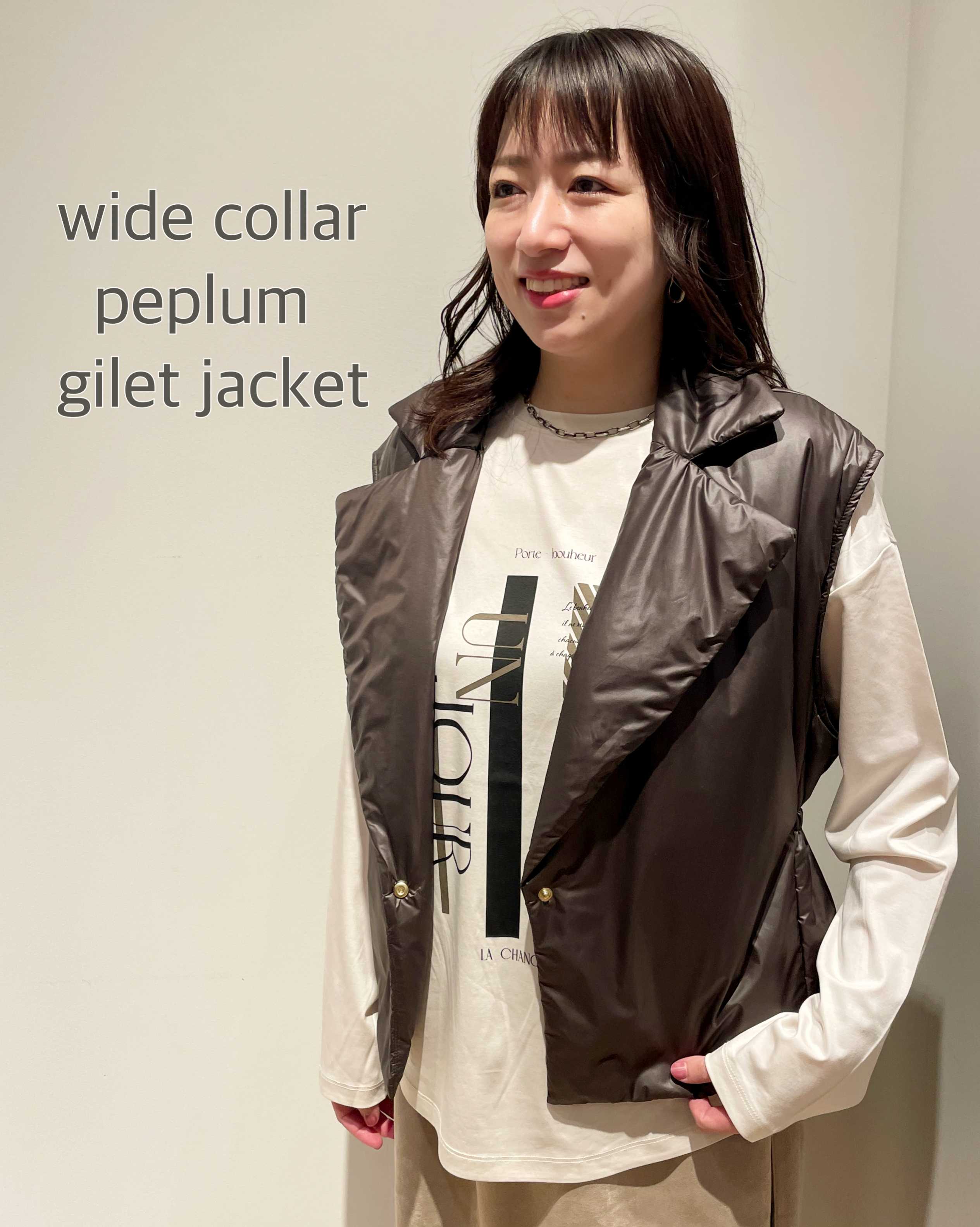 NEW 更新日:2025.10.29 anRipply 06-6646-1201 ワイドカラーペプラムジレ これからのシーズンに大活躍する中綿ジレが入荷しました! 薄手のナイロン素材を使用しているので、軽い着心地です。 ワイドカラーで小顔効果も◎ ウエスト周りはペプラムになっていて、女性らしいスタイリングにピッタリです! オンラインストア インスタグラム 関連キーワード #記念日 #プレゼント #新商品 #コーデ #お出かけ X この店舗のショップニュース スウェットライククルーロゴプルオーバー リングヤーン×シャギーVネックカーディガン フェイクファーワンハンドル2wayバッグ フェイクファー2wayバッグ ランタンスリーブブルゾン パンチングショルダーバッグ ロゴ入りブークレニット LuLuLuniy & anRipply OUTLET SALE☆ アニマル柄ショート丈ファージレ デニム ミドル丈ジャケット