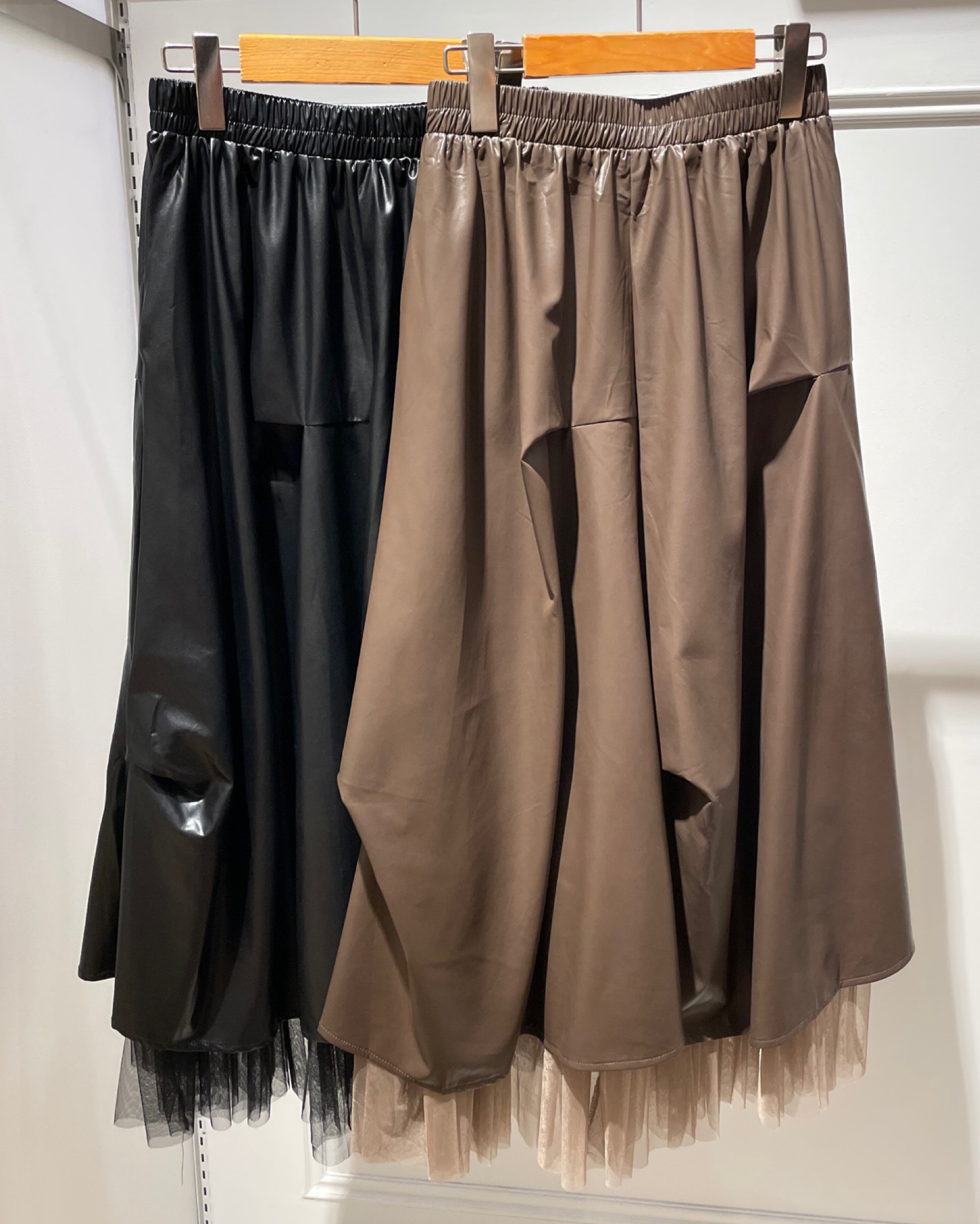柔らかいフェイクレザーとチュールを組み合わせた、甘辛デザインのスカート。