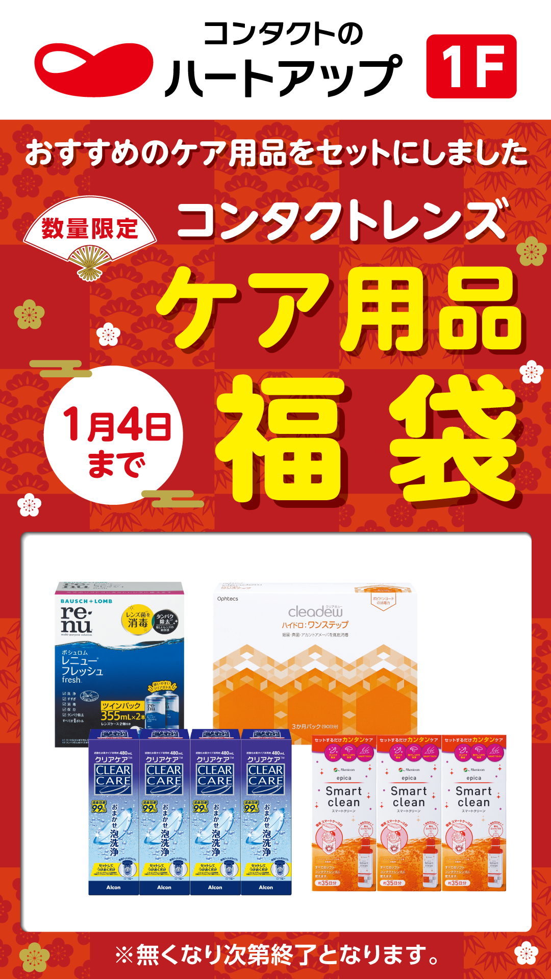 NEW 更新日:2026.01.01 ハートアップ 06-6649-3101 コンタクト洗浄液福袋 ハートアップ福袋開催中! コンタクトレンズ洗浄液がお得! アルコン AOセプトクリアケア福袋! オフテクス クリアデューハイドロ:ワンステップ福袋! など大人気の洗浄液の福袋を各種揃えています! 詳しくは店頭まで。 関連キーワード #BANG!BANG!BARGAIN! #福袋 X この店舗のショップニュース BARGAIN!コンタクトレンズウインターセール開催中 天王寺・阿倍野でコンタクト買うなら! コンタクトレンズ40%OFF マカロニえんぴつ×ハートアップ 【天王寺・あべのでコンタクトレンズを買うなら】ウインターセール開催