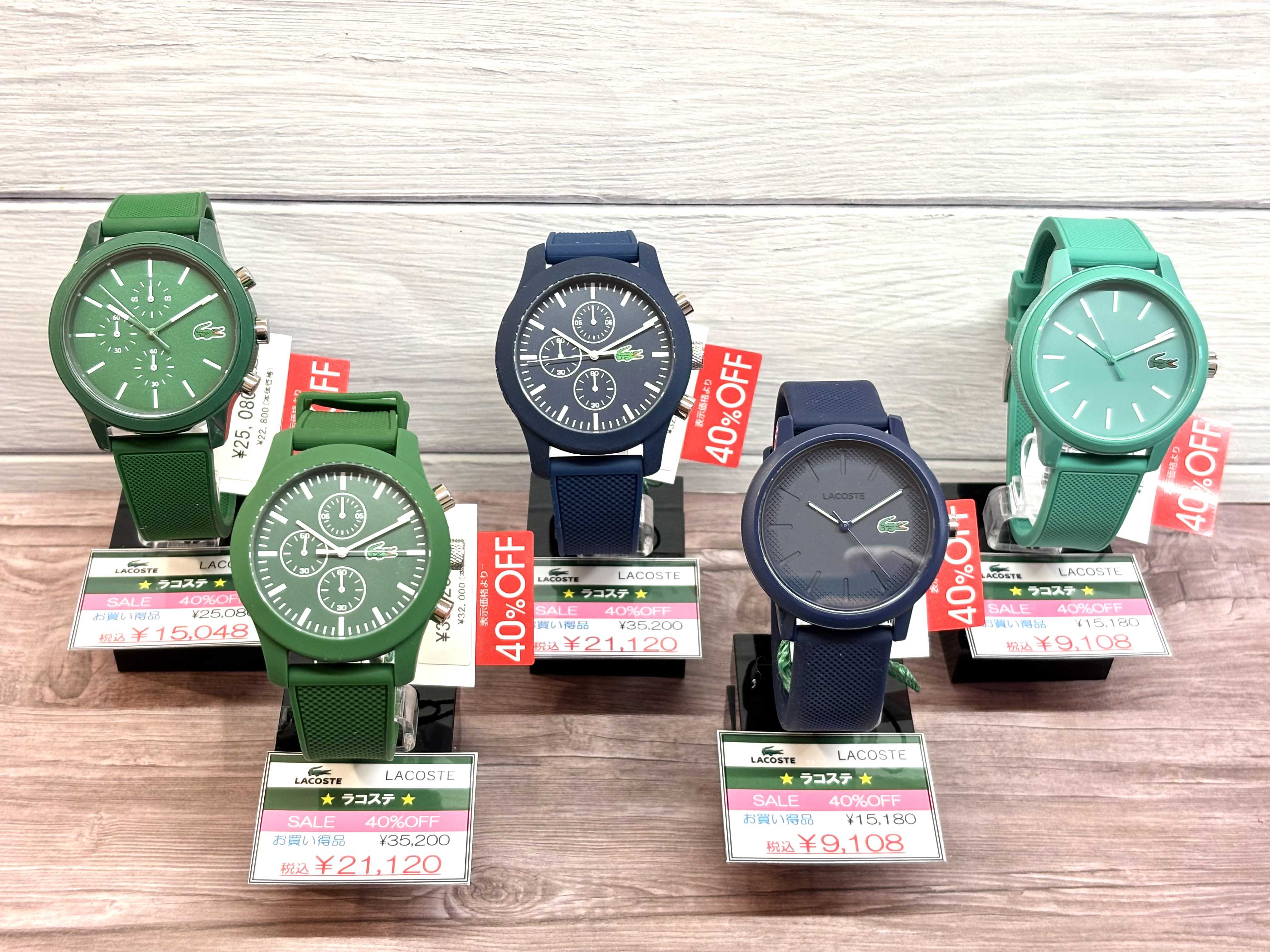 NEW 更新日:2026.04.10 TIME’S GEAR 06-6649-3366 LACOSTE(ラコステ)めっちゃお買い得~♪ TIME'S GEARあべのキューズモール店です! LACOSTE(ラコステ)めっちゃお買い得ですよ(^^) 対象モデルは、定価より40%OFFでのご案内です! この機会にぜひ、TIME'S GEARあべのキューズモール店へお越し下さいませ。 ***************************************** 関連リンクを見る X この店舗のショップニュース 【再入荷なし!】ティソPRX、カーボンケースモデルの魅力! 腕時計の電池交換ご相談ください。 【SEIKO】光り輝くエメラルドグリーンに惚れてしまう! SEIKOプロスペックスCORE SHOPモデル入荷中! 【CITIZEN】日本の美"桜"をイメージした機械式腕時計 【CITIZEN】気軽に機械式腕時計を楽しめる!! 【G-SHOCK】大人気の欠品モデルが再入荷 電池交換ご相談ください!! 忙しい毎日に「CITIZEN xC」を着用して出かけよう! USED財布が多数入荷しました!!