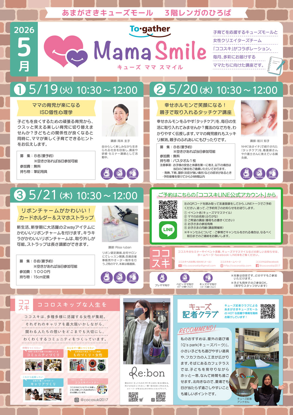 子育てを応援するキューズモールと、女性クリエイターズチーム「ココスキ」がコラボレーション。毎月、多彩にお届けするママたちに向けた講座です。