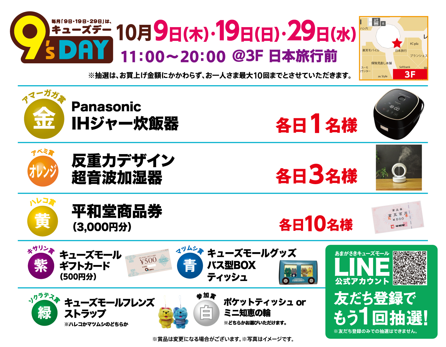 当日のあまがさきキューズモールでのお買物レシートの合計金額5,000円(税込・合算可)ごとに1回抽選いただけます。
