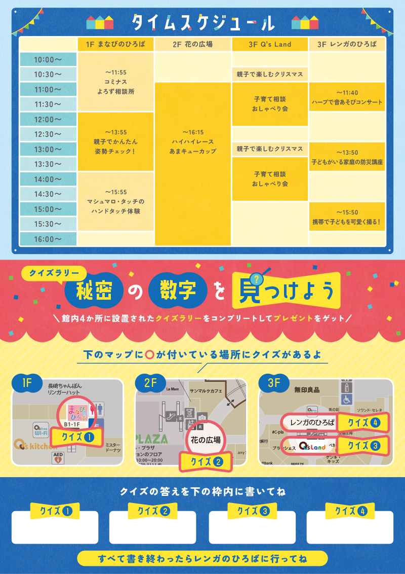 - 1F まなびのひろば、2F 花の広場、3F レンガのひろば、3F Q's Land(キューズランド)