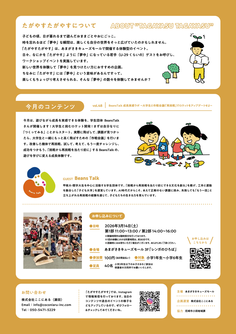 今月は、遊びながら成長を実感できる体験を、学生団体BeansTalkさんが開催します!大学生と挑むロケット開発!まずは自分なりに「つくってみる」ことからスタート。実際に飛ばして、課題が見つかったら、大学生と一緒にもっと高く飛ばすための「作戦会議」を行います。改善した機体で再挑戦。試して、考えて、もう一度チャレンジし、成功をつかもう。「挑戦から再挑戦を当たり前に」するBeansTalkの、遊びを学びに変える成長体験です。