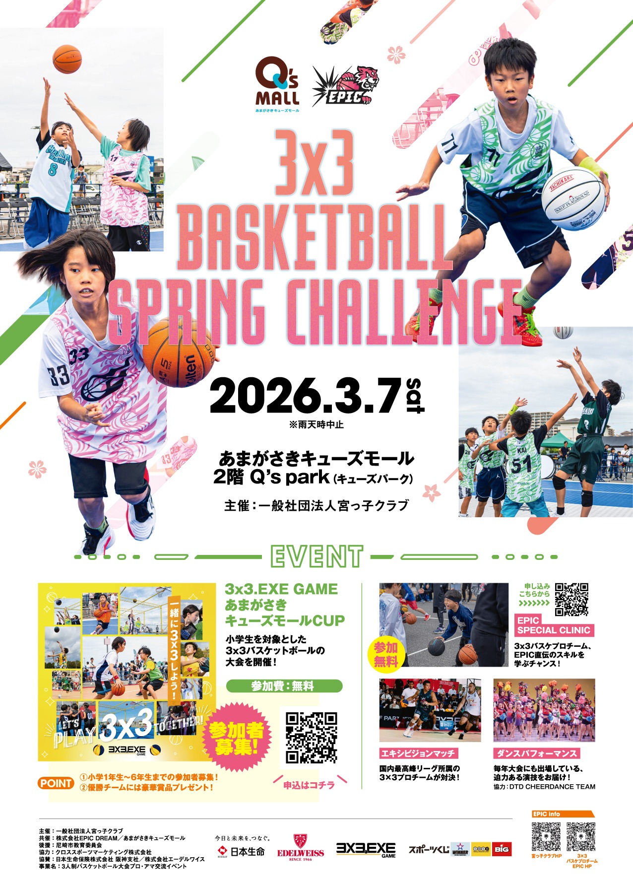 小学生3x3大会「3x3 BASKETBALL SPRING CHALLENGE」をはじめ、プロ3×3チームのエキシビジョンマッチ、プロ選手によるクリニック、誰でも参加できるシュートチャレンジ、迫力のダンスパフォーマンスなど、観ても参加しても楽しめるプログラムが盛りだくさん!熱気あふれる一日を、あまがさきキューズモールで!