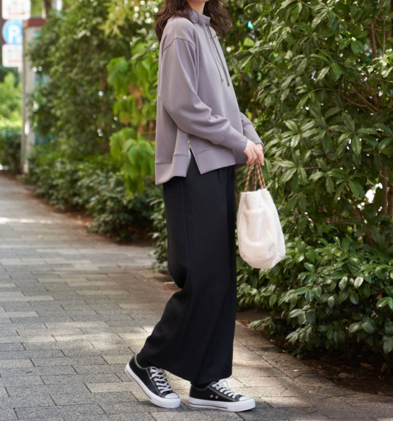 ・首元にきれいに沿ったモックネックはカジュアル過ぎず大人な雰囲気の抜け感を演出