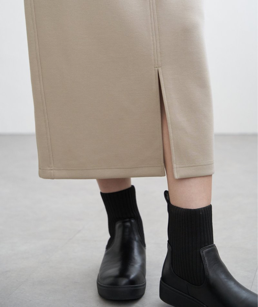 なめらかな肌ざわりとほどよいハリ感が魅力のダンボールニット素材を使用したタイトスカート。