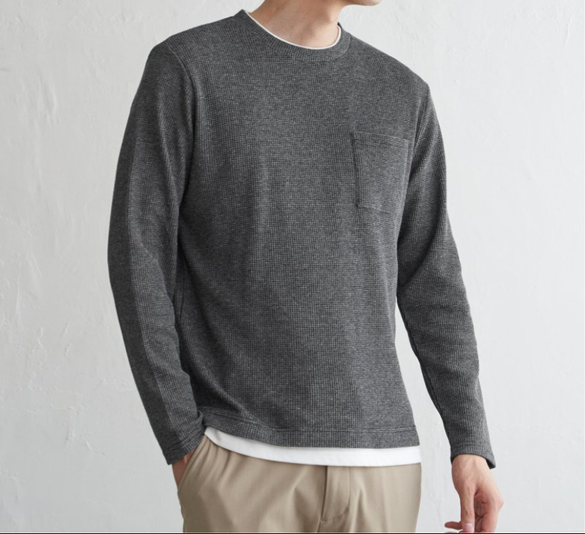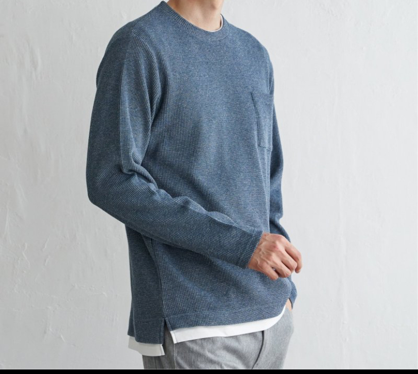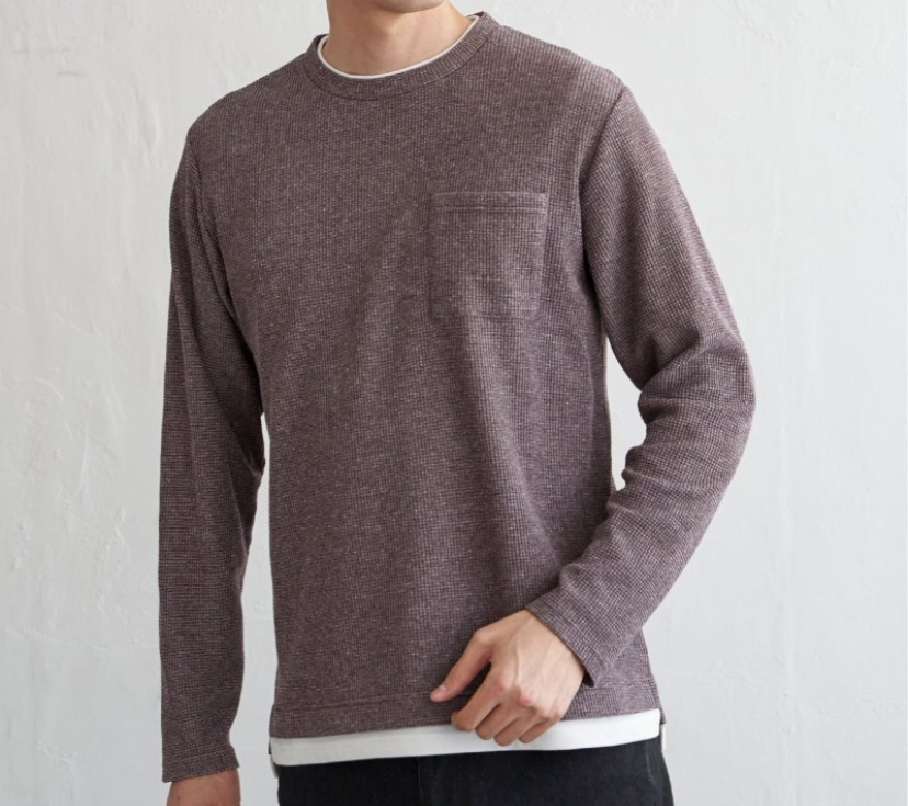 着込まずに洒落る、ワザありロンT メランジワッフルポケフェイクロンT 税込¥3,729