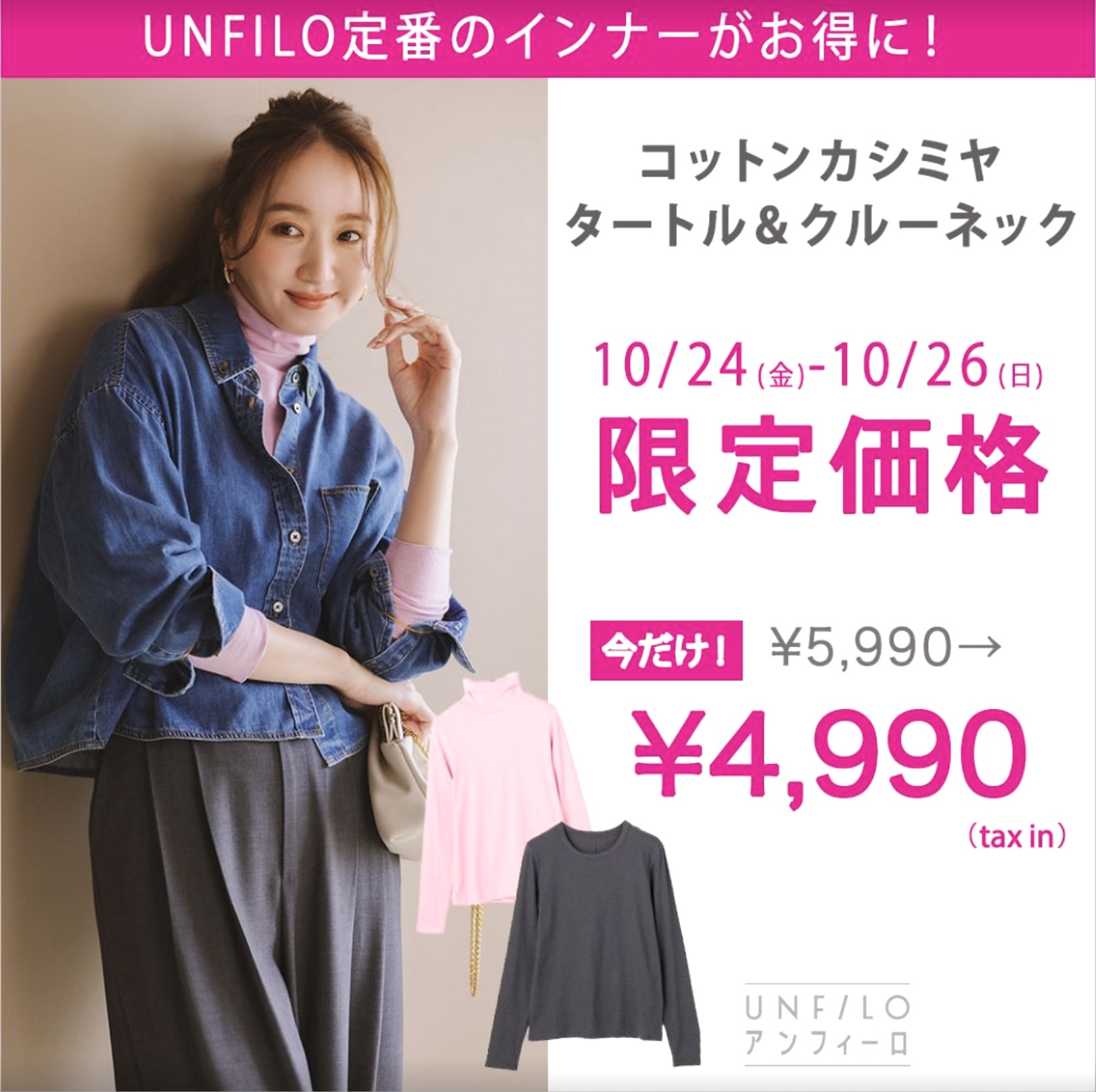 タートル・クルーネックの2型のカットソーは ¥4,990 の限定価格。