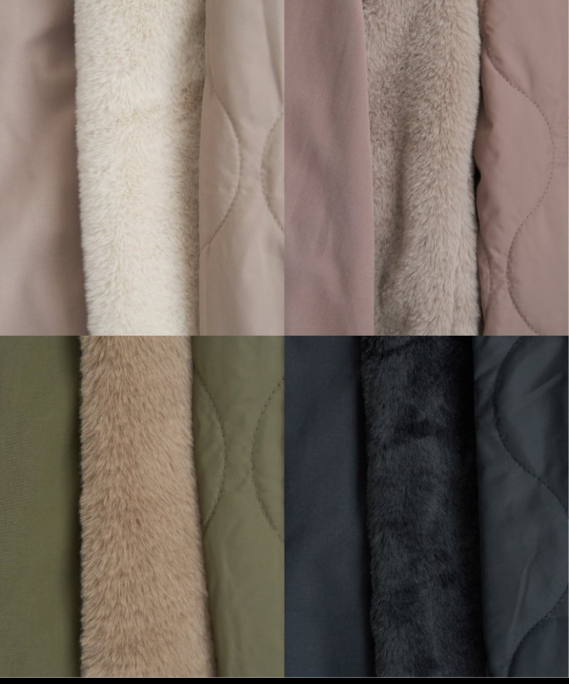 しっかりした微起毛ピーチの表素材と、やわらかいタッチのフェイクファー×中綿キルトのライナー。