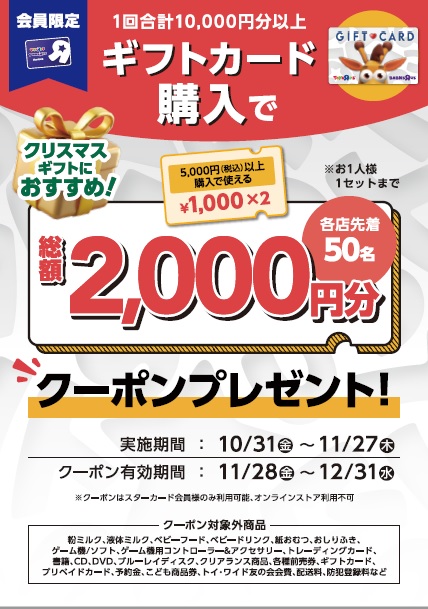 期間中にスターカード会員様限定で「トイザらス・ベビーザらスギフトカード」を