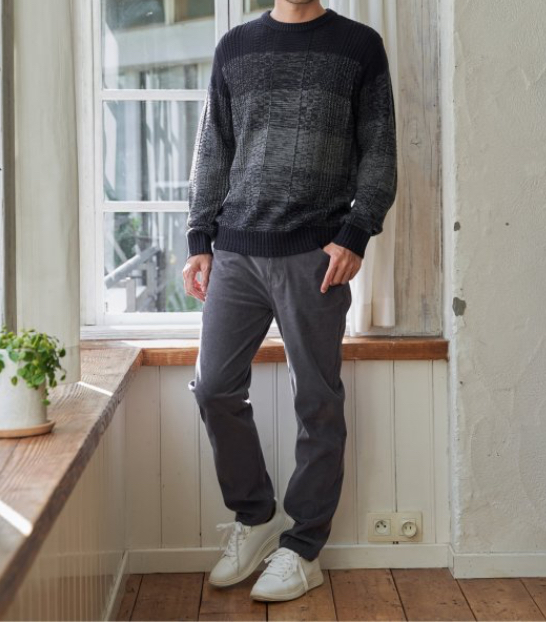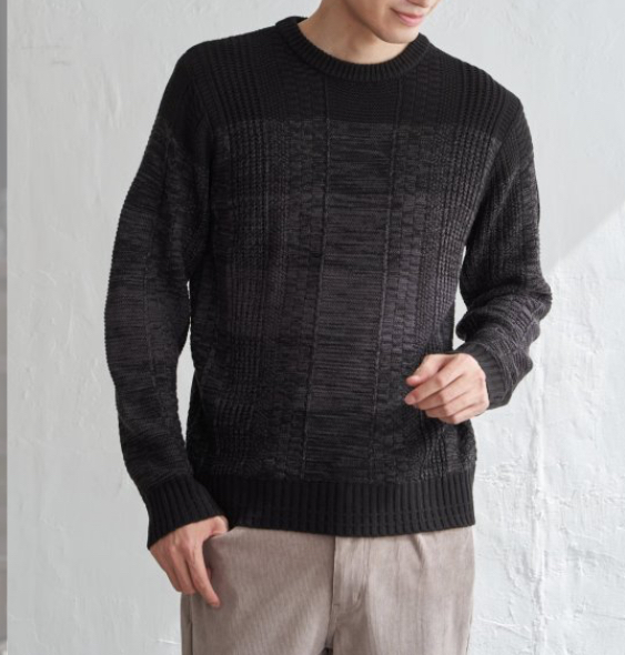 糸の色味を巧みに配合し、メランジ調の濃淡でグラデーションを表現したニット。