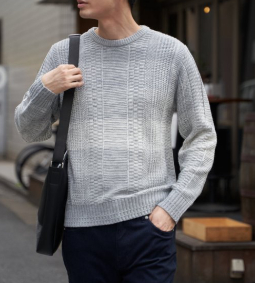 膨らみのあるアクリル糸を使用し、地柄のジャカード編みで仕上げたプルオーバーニット。