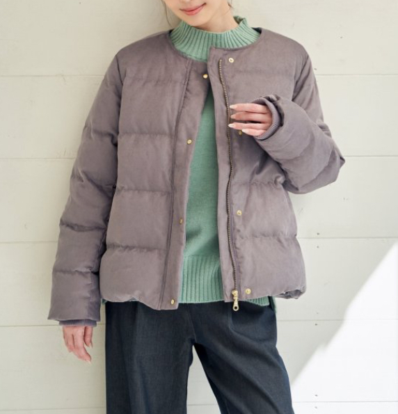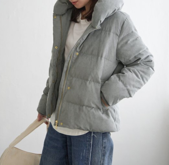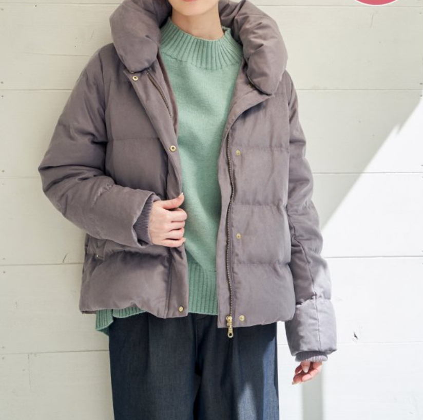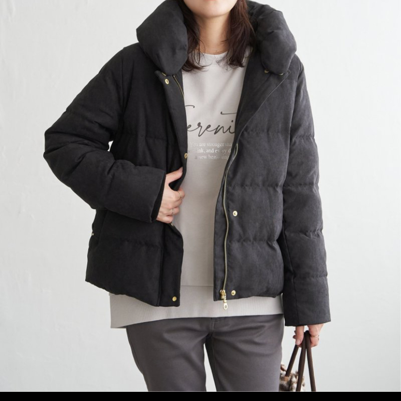 襟元にボリュームをもたせ、小顔効果のあるシルエットショート丈ダウン。