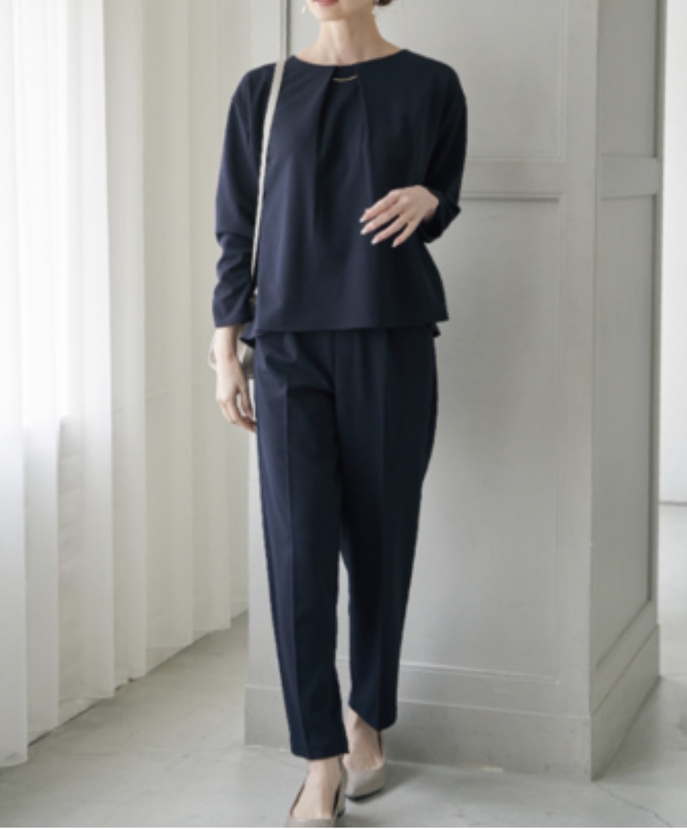 ペプラム切替えのトップスとシンプルなテーパードパンツのセットアップです。