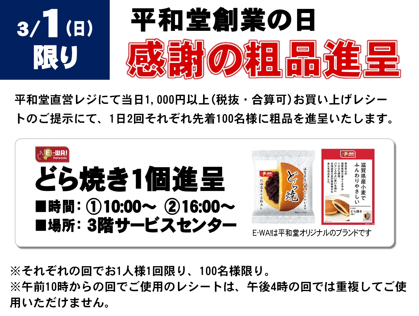 平和堂直営レジにて当日1,000円以上(税抜・合算可)お買い上げレシートのご提示にて、1日2回それぞれ先着100名様に粗品を進呈いたします。