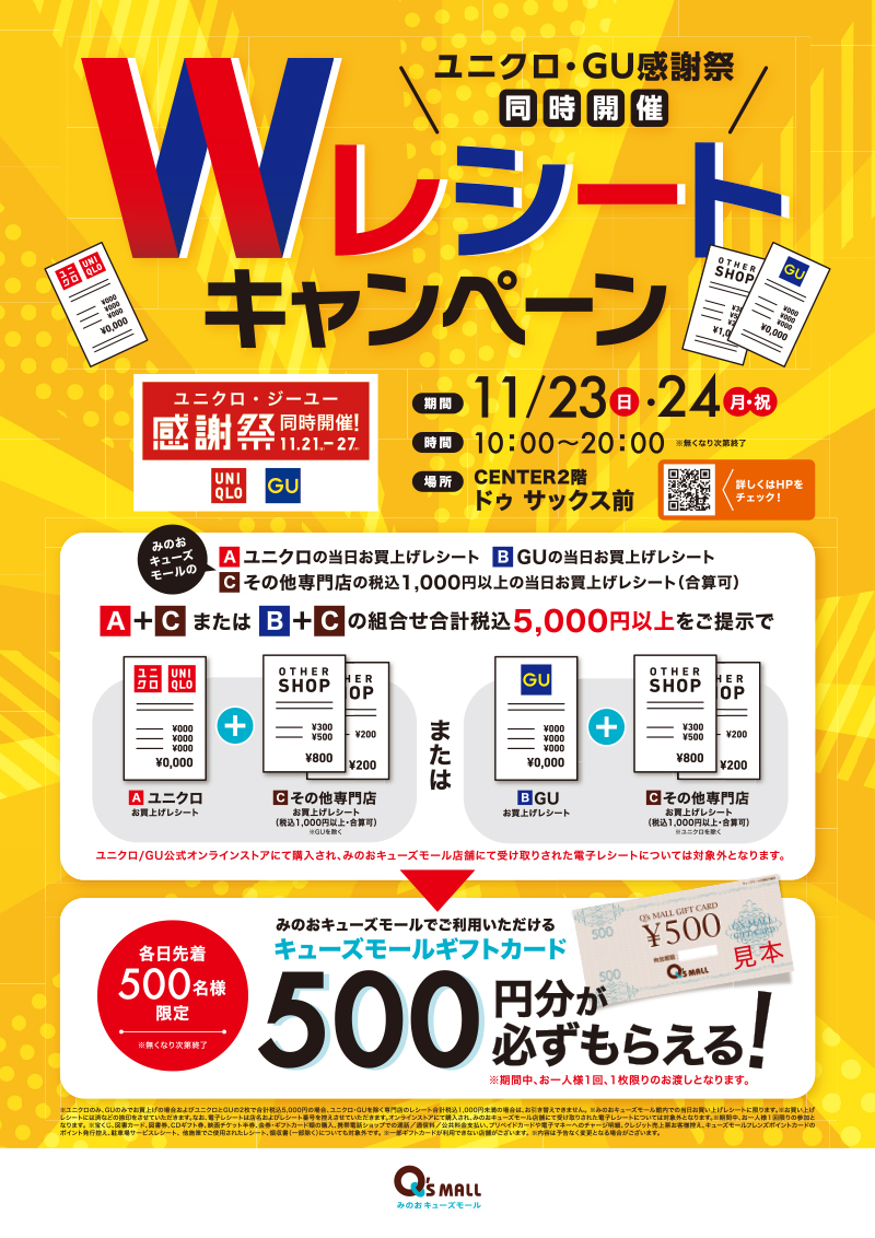 ※お買い上げレシートには済などの捺印をさせていただきます。なお、電子レシートは店名およびレシート番号を控えさせていただきます。オンラインストアにて購入され、みのおキューズモール店舗にて受け取りされた電子レシートについては対象外となります