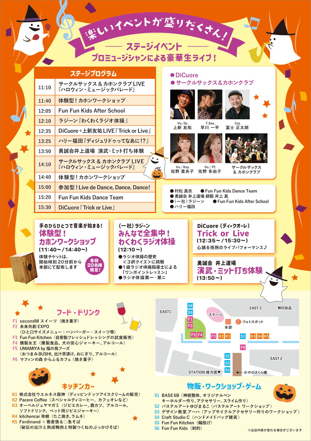 生演奏でラジオ体操、カホン体験、空手のミット打ち体験など、小さなお子様からご年配の方まで楽しめるプログラムもございます。