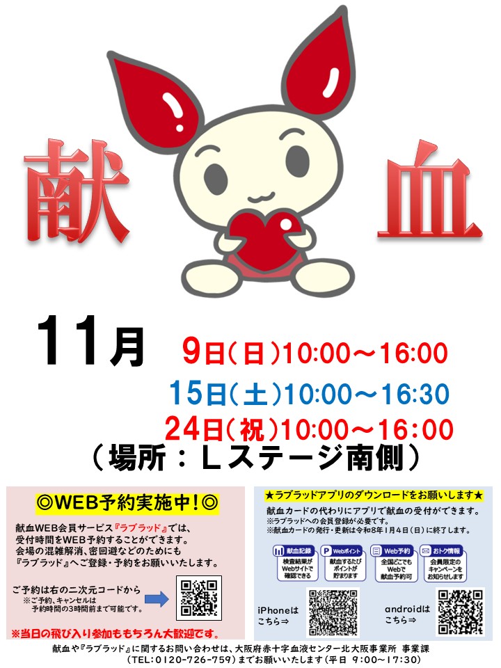 ※コロナ対策として、ラブラッド会員による「事前予約」を行っています。 (献血当日は「事前予約」の方を優先して案内する場合がございます。ご了承ください。)