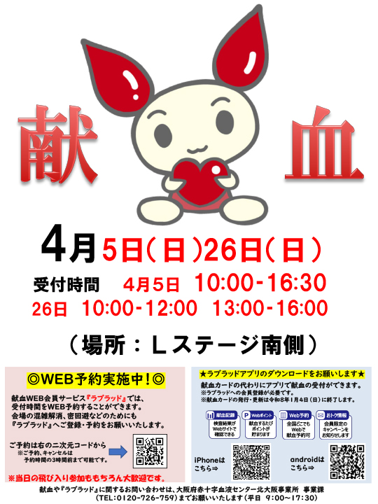 ※コロナ対策として、ラブラッド会員による「事前予約」を行っています。 (献血当日は「事前予約」の方を優先して案内する場合がございます。ご了承ください。)