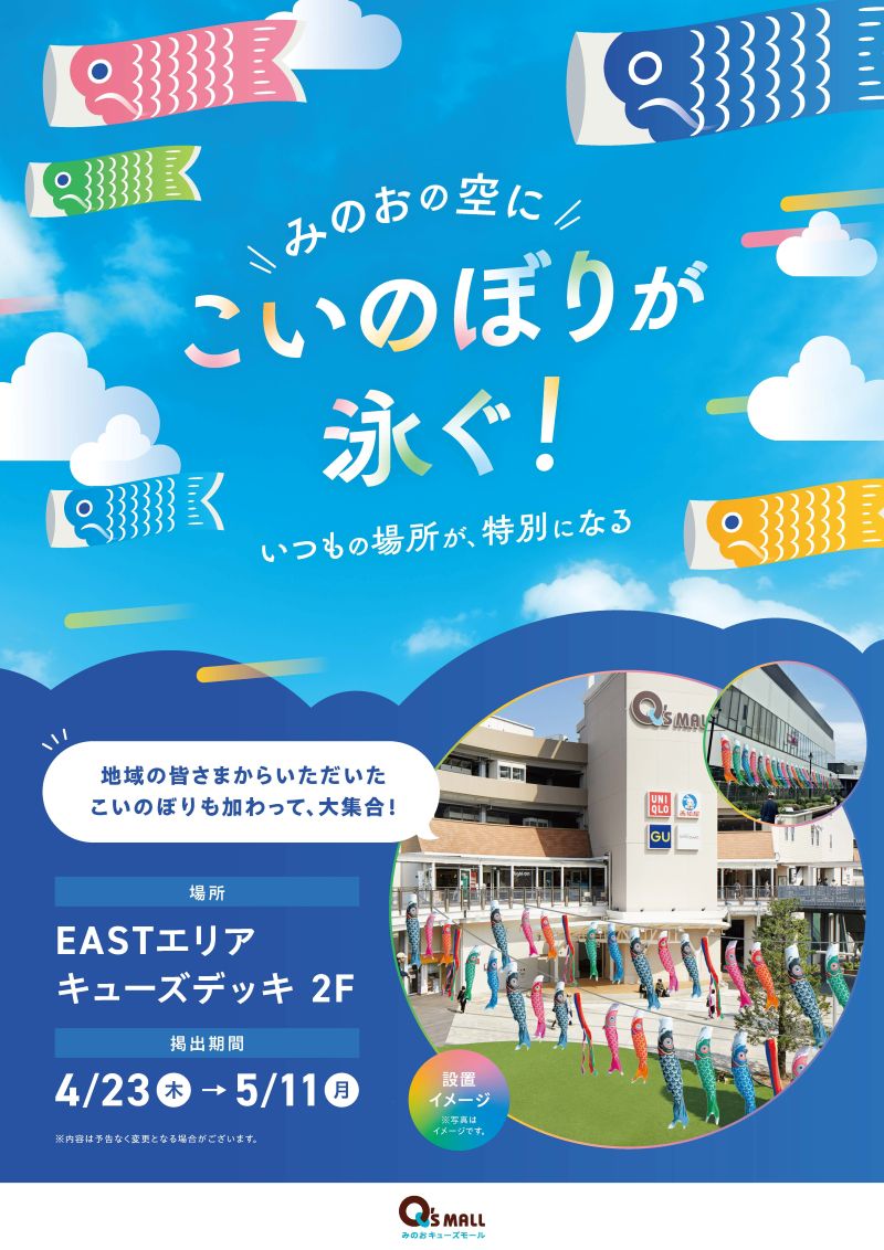 季節(旬・季節感) みのおの空にこいのぼりが泳ぐ! 日程 2026年4月23日(木)~5月11日(月) みのおキューズモール春の新たなシンボルこいのぼり掲揚を初開催いたします。 こいのぼりの一部は地域のみなさまが使わなくなりご自宅に眠っているこいのぼりをご寄付いただものを掲揚しております。 大空を泳ぐこいのぼりの姿をお楽しみください。 基本情報 場所 EASTエリア-2F キューズデッキ 主催者 みのおキューズモール お問い合わせ 電話番号:072-729-1090 受付時間:10:00~18:00 X イベント・POPUP一覧へイベントカレンダーへ