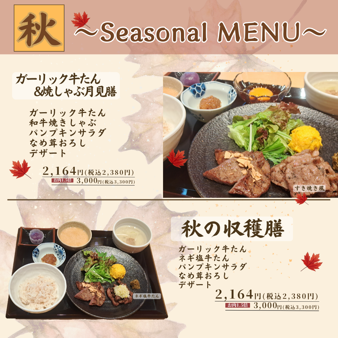 仙台発祥の「牛たん焼き」と厳選和牛を遠赤で中はジューシーに外はカリっと香ばしく、一枚一枚丁寧に焼き上げ、定食スタイルでご提供いたします。食物繊維豊富な「麦飯」と自慢の「大和芋とろろ」とご一緒にお召し上がりください。また、「麦飯」はいつでもおかわり無料のサービスとなっているので、思う存分にお召し上がりいただける事も大変喜ばれております。お子様メニューやカトラリーもご用意して皆様のご来店をお待ちしております。