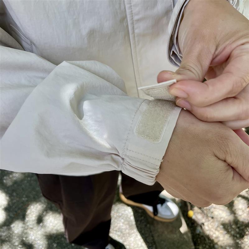 紫外線から肌を守り、袖口のテープを絞ると雨風の侵入も防ぐ