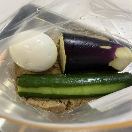 今回は1人分として、きゅうりとナスを2分の1本ずつ、ゆで卵を1つ入れて作ってみました。