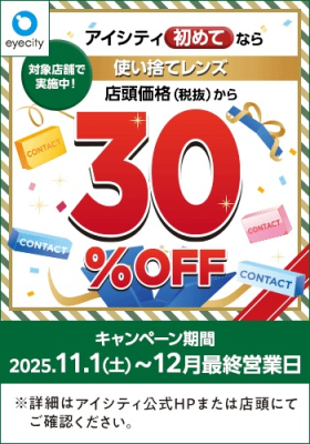 【12月末まで!】 \アイシティ初めてなら/対象店舗で実施中!使い捨てレンズが店頭価格(税抜)から30%OFF!