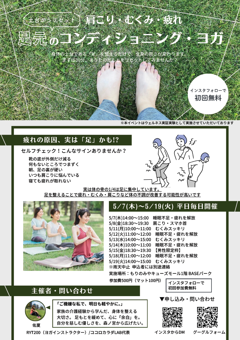 この足元を整える「コンディショニング・ヨガ」を5/7(木)〜5/19(火)まで平日毎日開催します。