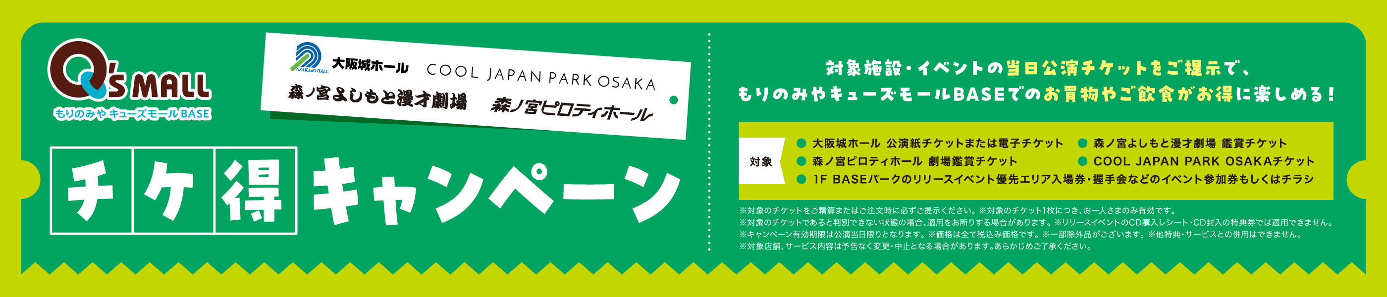 対象施設・イベントの当日公演チケットをご提示で、もりのみやキューズモールBASEでのお買物やご飲食がお得に楽しめる!